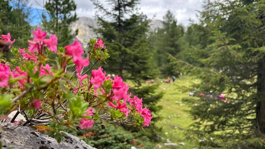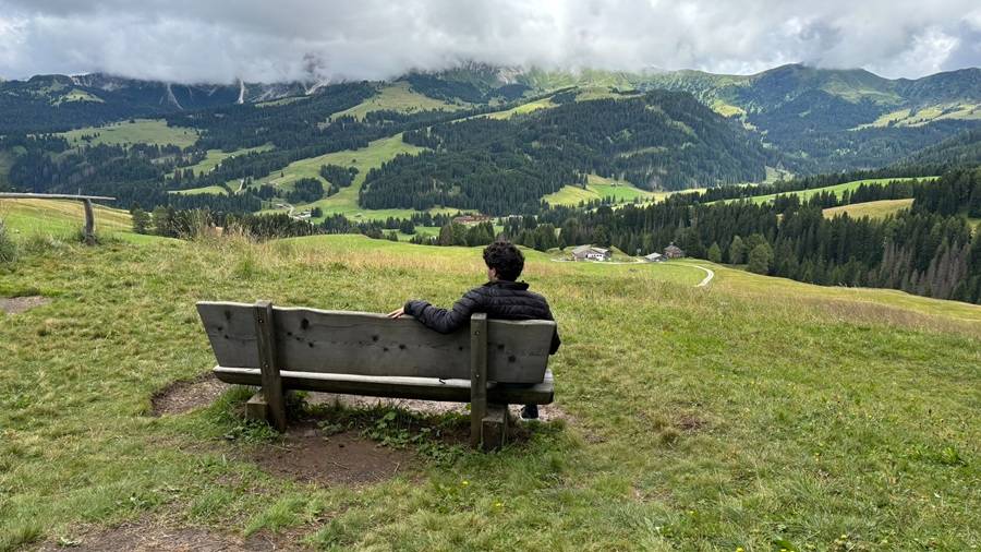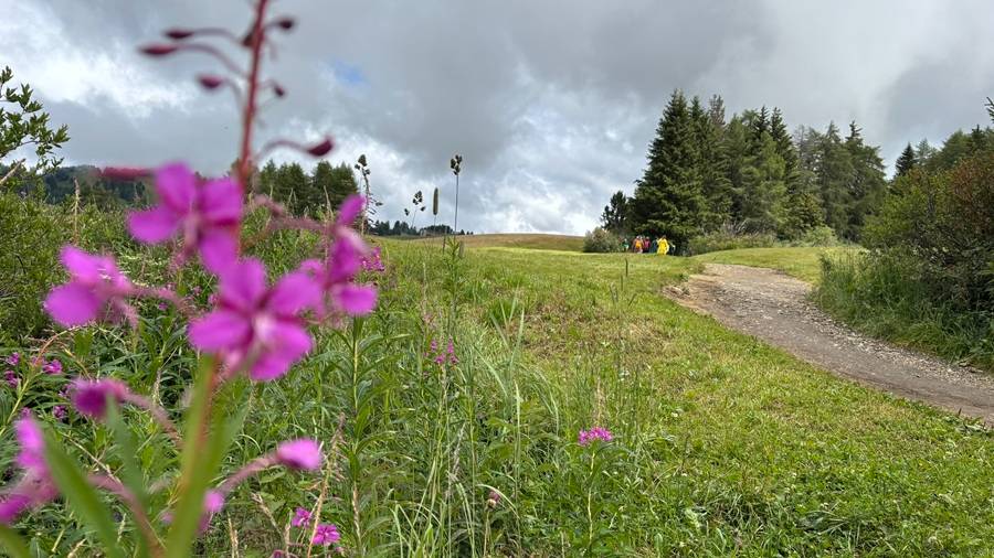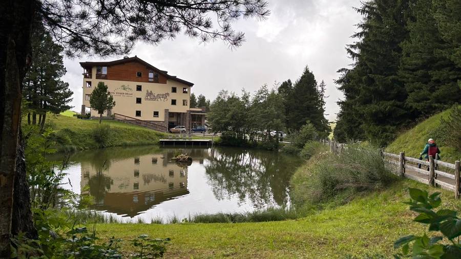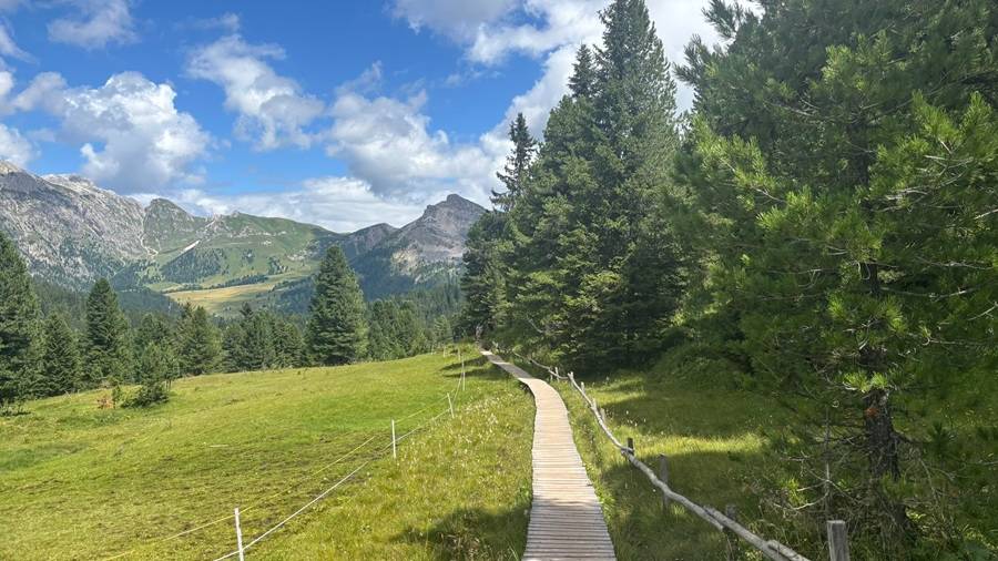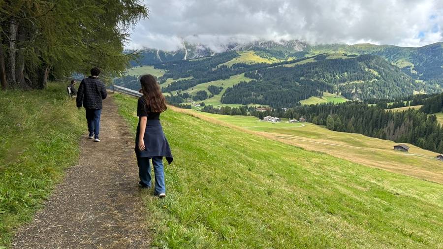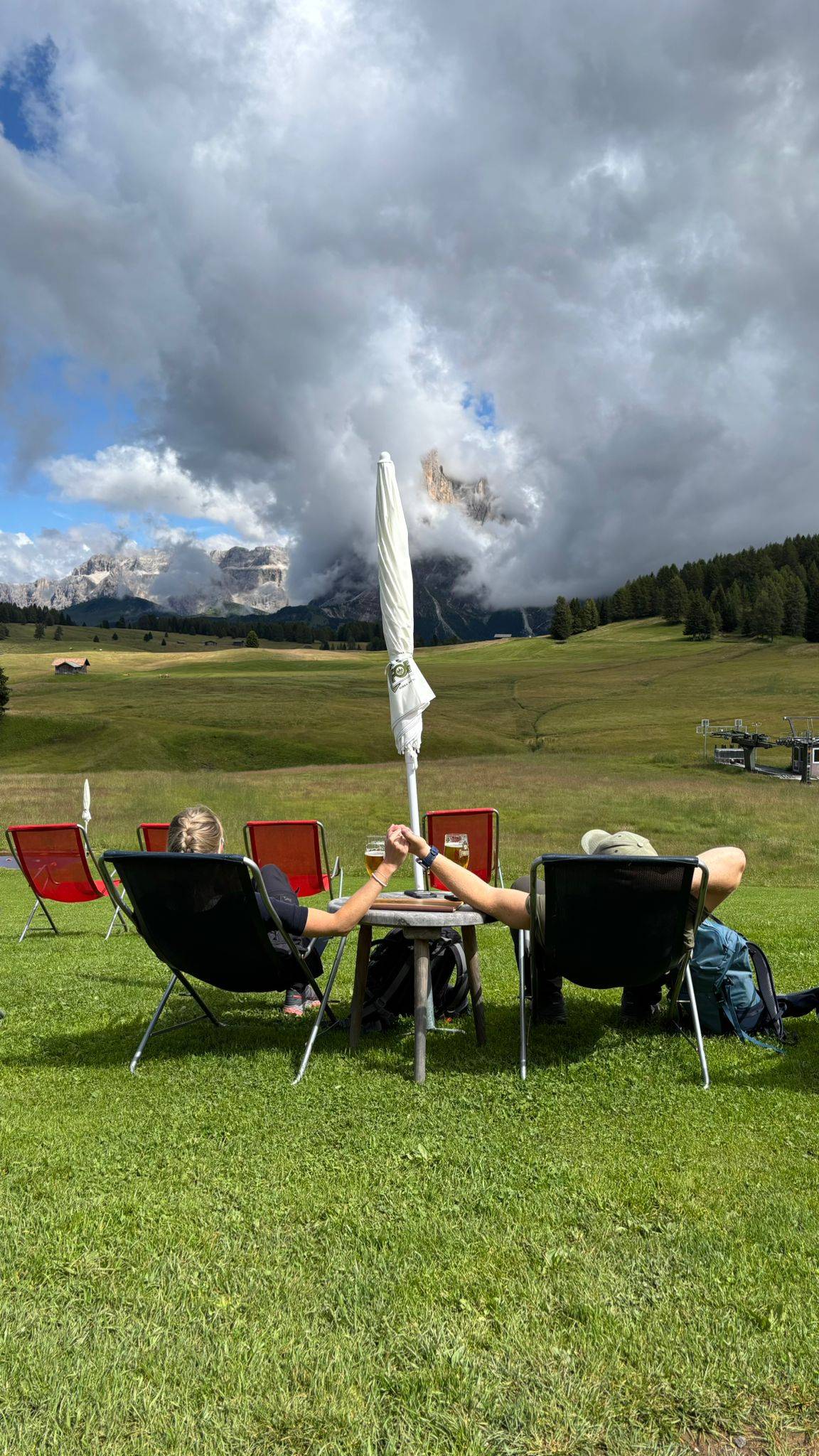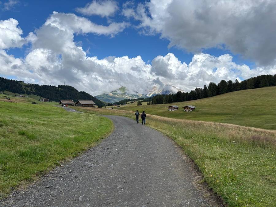 הטיול באלפ דה סיוסי פשוט מאוד ומתאים כמעט לכולם. תנאי השטח נוחים ואין כמעט עליות או ירידות. כנראה שבשלב כלשהו החלטנו לקחת פנייה שהאריכה לנו את הדרך לבקתה. בימים ללא עננים כשהכל בהיר, הנוף של רכסי ההרים מסביב מטריף. צעדנו וקיווינו שיתבהר והעננים יתפזרו. כך או כך המרחבים מסביב המנוקדים בבקתות עץ, מלונות ופרחי בר פשוט קסומים. עשינו בסוף טיול מעגלי ומצאנו את הפנייה הנכונה לבקתה. כשהגענו התיישבנו לארוחת צהרים טעימה. אני ממליצה לנסות מנות מקומיות המוגשות בבקתות ההרים. כדאי להגיע לפני השעה 15:00 אז נסגר המטבח. בזמן שאכלנו העננים התפזרו קצת סוף סוף ורכסי ההרים נגלו מרחוק ויצרו תפאורה מרהיבה.