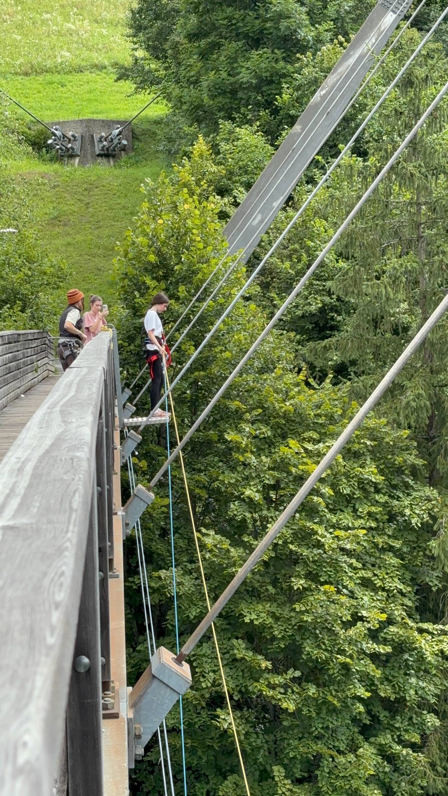 קמנו לבוקר נעים יחסית וגילינו שיש לנו פנצ'ר. הלם! כבר ביום הקודם ראינו שיוצא לנו האוויר מאחד הגלגלים. אבל הבוקר זה כבר היה ברור שאי אפשר להמשיך בתוכניות כרגיל. אין ספק שזו היתה חוויה מבאסת אבל אין מה לעשות, לפעמים צריך לנשום ולשחרר. אז מה עושים? התחלנו לעשות טלפונים לחברת ההשכרה. בזמן שחיכינו לנציג של החברה שיבוא להעריך מה מצבנו, החלטתי לצאת עם הילדים לטיול רגלי קצר לגשר בני רייך Benni Raich-Brücke. אל הגשר ניתן להגיע בהליכה קצרה מהכפר החמוד שלנו. מלבד המראה היפהפה של הנהר והגשר הגבוה, ניתן לצפות בימים מסוימים בקופצי בנג'י אמיצים ואמיצות המזנקים מהגשר. חוויה משוגעת. הדרך לגשר עוברת בתפאורה מקסימה של שדות מנוקדים בפרחי בר ומראה הכנסיה מהעיירה שממול. כשחזרנו חזרה התיישבנו על ספסל מול הנוף כשפעמוני הכנסייה מצלצלים והכל מסביב שקט ורגוע.