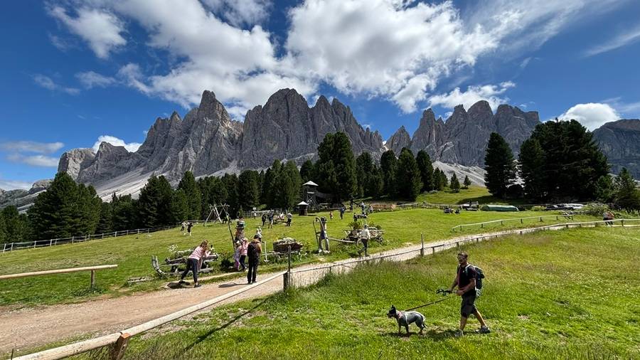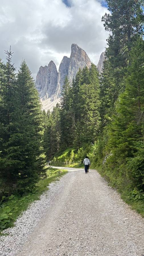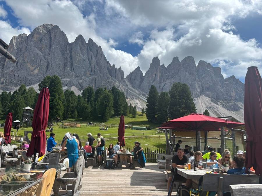 יש כל מיני דרכים להגיע למעלה אל הבקתה עם הנוף הכי יפה שיש. לא סתם קוראים לתצפית המטריפה: Cinema delle Odle, כי לשבת מול הנוף המטורף הזה באמת מרגיש כמו חוויה מהסרטים. אנחנו בחרנו להתחיל את הטיפוס למעלה בשביל מספר 6 ואחר כך המשכנו בשביל 35 ואז 36. הטיפוס לבקתה בעלייה יחסית מתונה לקח לנו כשעתיים וחצי כולל עצירות לנשנושים, צילומים ומנוחה. לאורך כל הדרך ליווה אותנו רכס ההרים היפהפה והמרשים. בהתחלה היתה עננות ולאט לאט מזג האוויר התבהר ולמעלה השמיים כבר היו כחולים בוהקים. אל הבקתה עצמה הגענו כבר מאוד רעבים. ממליצה בחום לפני או אחרי האוכל להתעכב על הספסלים או כסאות הנוח שהוצבו מאחורי הבקתה מול ההרים המשגעים. לילדים יש במקום גם מגרש משחקים. את הדרך למטה כבר ירדנו בשביל 34 שיורד בדרך הכי קצרה למטה. כשעה הליכה.